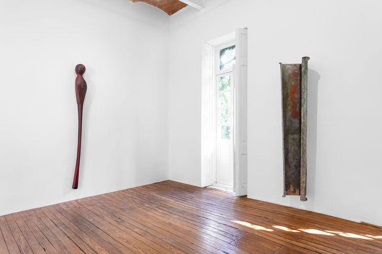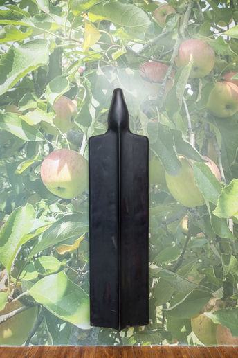 Vertical forms like Metamorphosis (D) and Metamorphosis (G) appear both alluring and hostile. Their surfaces echo the painterly application of her previous sculpture, but their shapes are more nebulous, even anthropomorphic. In Metamorphosis (D), a slender mahogany figure hovers before a blank wall, while Metamorphosis (G) looms, foreboding like a mummy sealed in a smooth sarcophagus. Nearby, Metamorphosis (C) suggests a more deviant transformation––part silvery chrysalis, part cracked open drainpipe, seemingly abandoned mid-metamorphosis. Mounted against a massive photographic wallpaper of an enlarged apple tree, Metamorphosis (D) appears dwarfed, suspended like an ornament before the oversized fruit-bearing branches. The scene recalls a sun-faded billboard––an artificial nature looming behind a shadowy, shifting form.