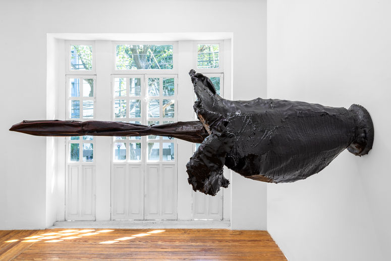 Vander Borght’s latest sculptures push further into the anthropomorphic and biomorphic, reaching their most nightmarish forms yet. A monstrous purple-and-black figure, reminiscent of a corpse flower, erupts from the wall. The actual plant, known for its brief bloom and acrid stench, radiates heat—her version seems to burst through tar. Mounted at shoulder height and inverted, its central spear thrusts outward with malice. Its shiny belly appears wet as if covered by gasoline. It bulges like a snake digesting its prey.