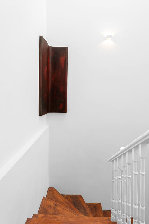 Charlotte vander Borght's recent work undergoes a similarly grotesque transformation, merging the industrial and the organic. Her exhibition opens with a netted, pond-scum-colored sculpture from her ongoing series Someone, No One, Anyone started in 2019. Often inverted, mounted on walls, and nestled into architecture, works from the series seem to linger in limbo, silently awaiting metamorphosis. Initially inspired by New York subway seats, this series quickly became vehicles for abstraction, remodeling the prototype into mutable, tonal-shaped paintings. Using resin, fiberglass, urethane, and pigment, vander Borght continuously reshapes them into unrecognizable painterly variants.
