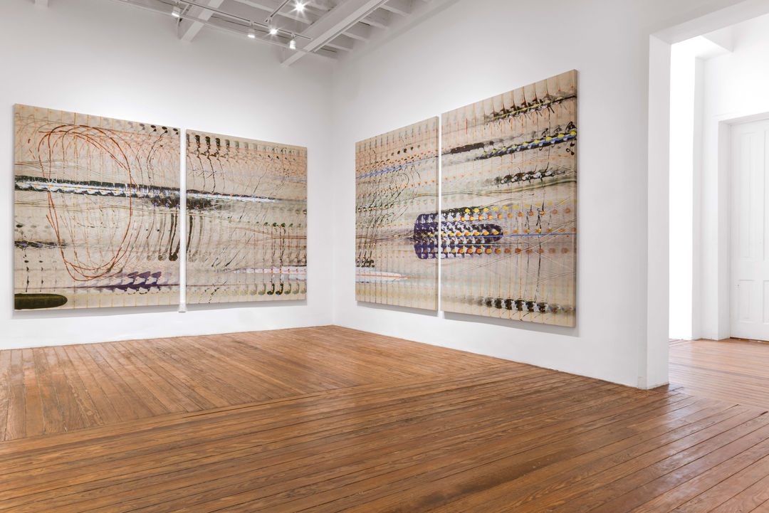 Ouroboros was made with ten pieces of canvas stitched together into one loop. The loop was then rotated around the mechanism, each individual piece of canvas carrying the trace of the others. At the end of the painting process the canvas was separated and stretched as ten paintings. Some appear coupled, while others insist on a distinct individuality.
