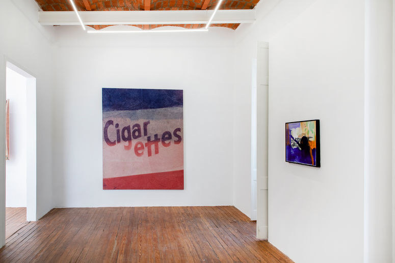 Nicolas Shake is an artist working in painting, photography, and sculpture. A third generation Californian, his practice, in his words, revolves around “the soft power of California Culture.” Which he defines as the points of juncture between surf, skateboard, and car culture, as well as the counterculture literary, sociological, pictorial and musical movements of the late 1960ʼs and 1970ʼs. Through the sustained absorption and repurposing of these influences, his stretched works function as high performance objects which propose the ability to decode and address these narratives, lifting them out of their seeming mundanity. Language is often employed as a visual anchor and literal device to articulate these themes with his own personal history. Artworks contain appropriated language and fonts from signage common to car garages, where the artist worked as a mechanic in his youth or for language commonly associated with the conceptions of labor and freedom indissociable from the mythology and romanticism of the West. Shake works with what is endemic to the everyday: a road littered with billboard advertisements, debris, neon signage, gas stations, open calls for work, all located within a space where the vast expanse of desert and Pacific Ocean collide. Enmeshed, his work occupies the liminal space between the West as both an idealized and allegorical construct; much of the intent behind his practice is made up of their concurrent upholding and demystification. Shakeʼs stretched works flourish in this same realm, holding these notions as polemics, relishing in the visuality and mimesis of California culture while examining its influence, itʼs soft power, on American dogma at large and the economic systems which it exerts both on itself and the rest of the world; they attempt to act as binding or reconciling agents between both paradoxical notions. Created in Shakeʼs Los Angeles studio, as well as in the desert near Pearblossom, his childhood hometown, the canvas is hand dyed, exposed and weathered in the sun over varying lengths of time. By means of cardboard cutouts, Shake then builds the composition and applies the language which develops like a photograph in a mostly uncontrolled outdoor environment. Finally, the work is retrieved from the desert, washed and stretched; the process itself acting as a signifier for the repetitiveness of labor and the meditativeness of craft.